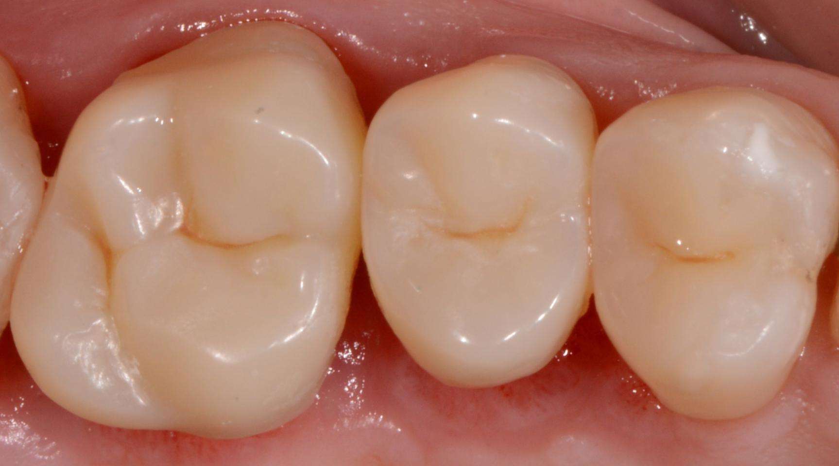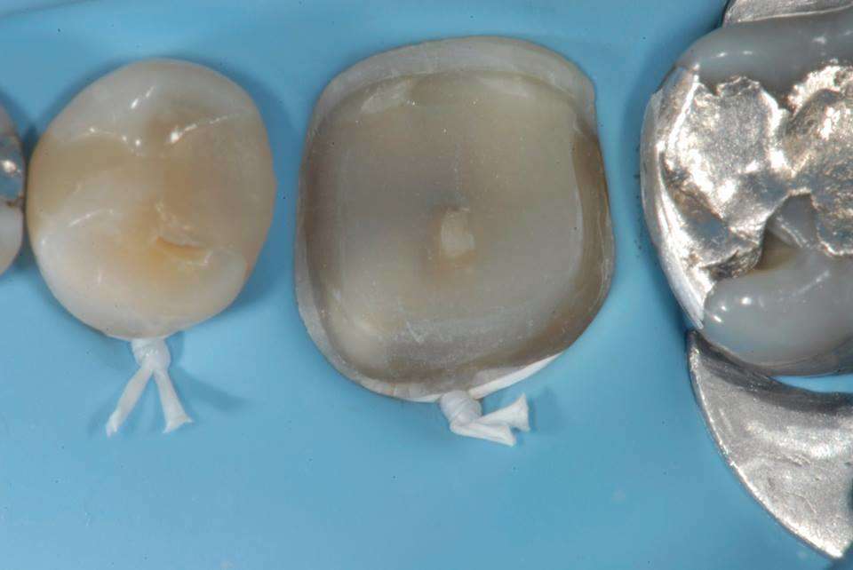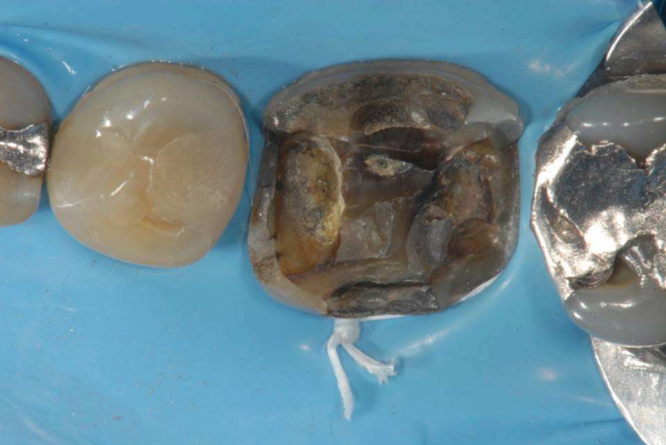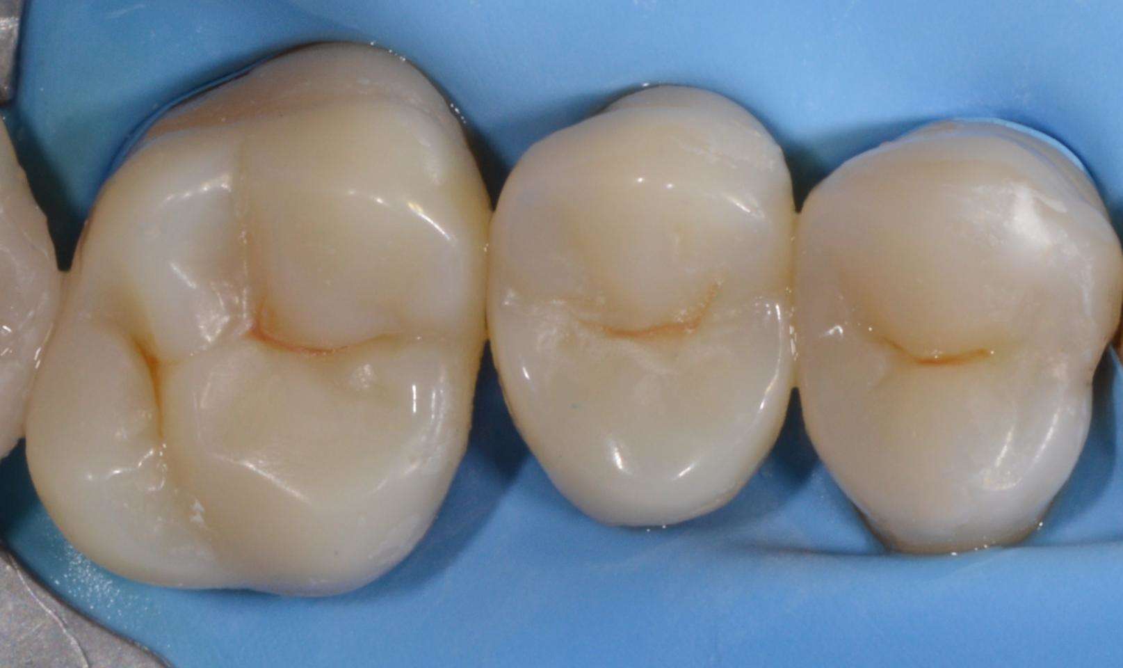 Deuxième séance : l’inlay est posé et collé dans la cavité de la dent. Ce collage est réalisé à l’abri de la salive grâce à un champ opératoire placé directement sur la dent. L’adhésion chimique aux parois dentaires consolide l’ensemble et assure une parfaite étanchéité de la restauration.