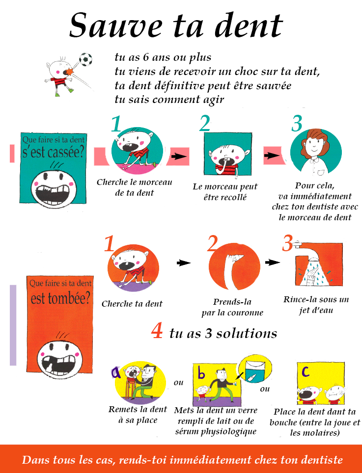 Essayez de retrouver le morceau cassé, conservez-le dans du lait ou du sérum physiologique ou défaut dans la salive de la personne, car il peut parfois être recollé.